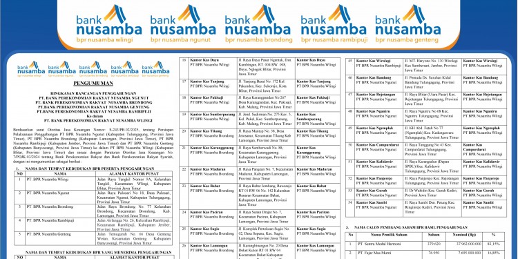 09 Okt PENGUMUMAN RINGKASAN RANCANGAN PENGGABUNGAN BPR NUSAMBA WILAYAH JAWA TIMUR Pengumuman Ringkasan Rancangan Penggabungan PT BPR Nusamba Ngunut PT BPR Nusamba Brondong PT BPR... Berita Perbankan